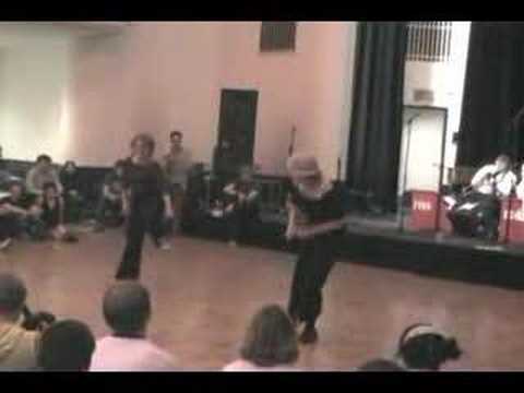 I wanted to expand on a thought in my last post where I previously pointed out the confrontational (in a friendly way) aspect of Sharon Davis and Max Pitruzzella’s dance off in the 2006 Ultimate Lindy Hop Showdown Solo Charleston Contest.